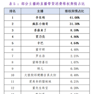 3月14日,北京阳光消费大数据研究院、消费者网等机构联合发布的《直播带货消费维权舆情分析报告(2023)》(以下简称《报告》)显示,在对17位主播的直播带货消费维权舆情数据分析后发现,涉及李佳琦的维权舆情最多,占比高达41%,相比2022年舆情数据,李佳琦舆情占比上升明显,增长了11.79%,疯狂小杨哥占比增长2.03%,而罗永浩、散打哥、蛋蛋小盆友、瑜大公子、烈儿宝贝、董先生珠宝等主播的维权舆情占比有所下降。