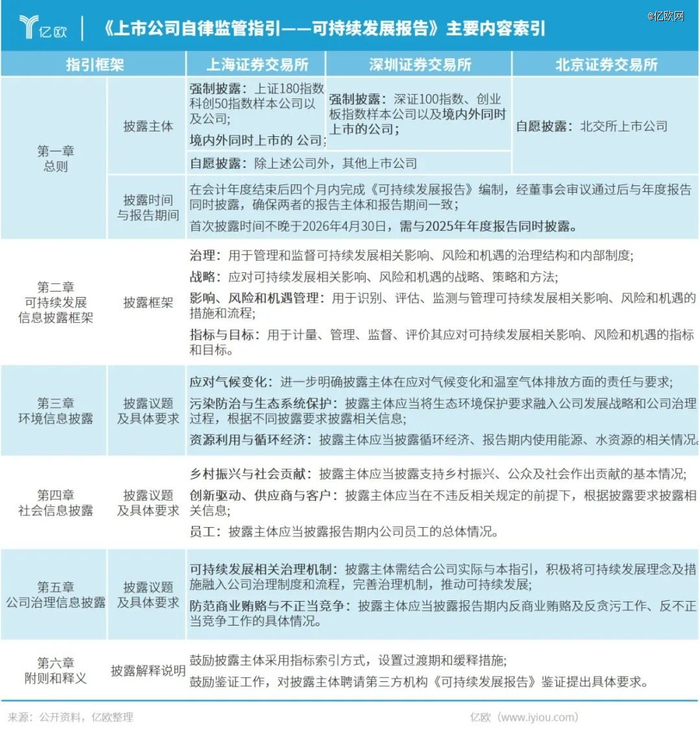 据《征求意见稿》,上海、深圳交易所采取了强制披露和自愿披露相结合的方式,北交所不对可持续发展报告作强制性披露规定,鼓励公司“量力而为”。除了披露主体适用范围有所差异外,其他的披露要求基本保持了一致,主要包含6章58条,设置20个具体议题。