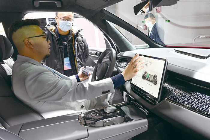 2023年12月1日,首届中国国际供应链促进博览会在北京举办。博览会智能汽车链展区涵盖产业链上中下游及服务四个板块,对核心原材料、元器件、工艺流程及不同车型等进行展示,全链条、全过程展现新动能驱动下智能汽车发展新能源化、智能化、舒适化的前景。图为参观者在智能汽车链展区一个展台了解新能源汽车新品。 李 贺 摄