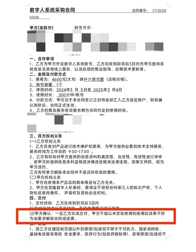 值得注意的是,购买数字人代理,普遍情况却是“有去无回”,无论效果如何,都难以退款。记者获取的多家数字人代理公司的合同显示,“不退款”直接被写进合同里,也成为行业惯例。