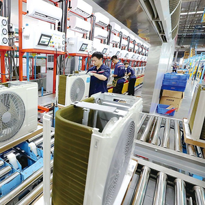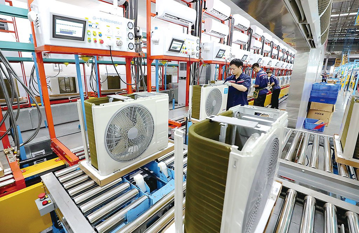 每年夏天都是空调的销售旺季。图为2023年7月21日,安徽省安庆市宜秀经济开发区内一家企业的生产车间,工人正在加紧生产空调。 江 胜 摄