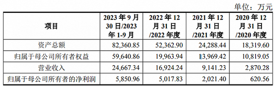 财务数据显示,2020年至2023年前9月,环动科技分别实现营业收入2870.28万元、9141.23万元、1.69亿元、2.47亿元,同期归母净利润分别是620.56万元、2021.4万元、5017.83万元、5850.96万元。