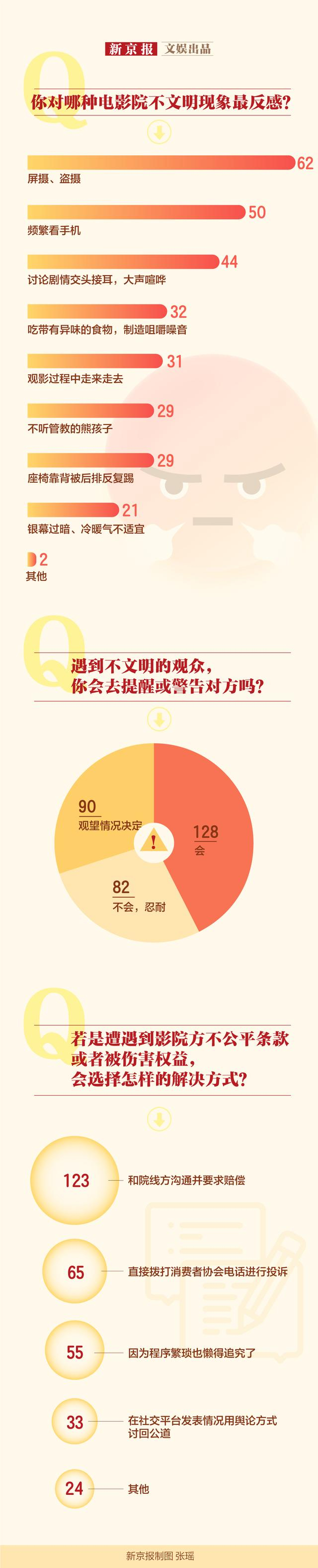 新京报抽样调查不同年龄阶层的观众共计300人,并挑选7名观众结合自身观影体验,总结他们在日常观影过程中遇到的问题后,再采访相关专家和律师,请他们针对观众的合法权益是否被侵害、如何减少不文明观影现象,提出合理解读和建议。