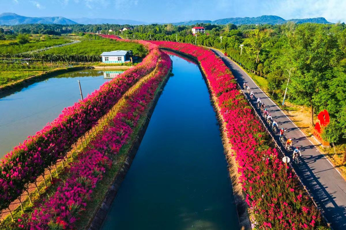 晓迎秋露一枝新,不占园中最上春。紫薇花一绽放,浪漫就悄然而至,带着独特的温柔和精美,显露出浓情厚意。百里花果生态观光带零陵段全长36公里,以花、果为主题,打造出紫薇花长龙、果蔬采摘和灌渠漂流等景点项目。观光带四季有景、四季有花、四季有果,为零陵区乡村旅游示范点。