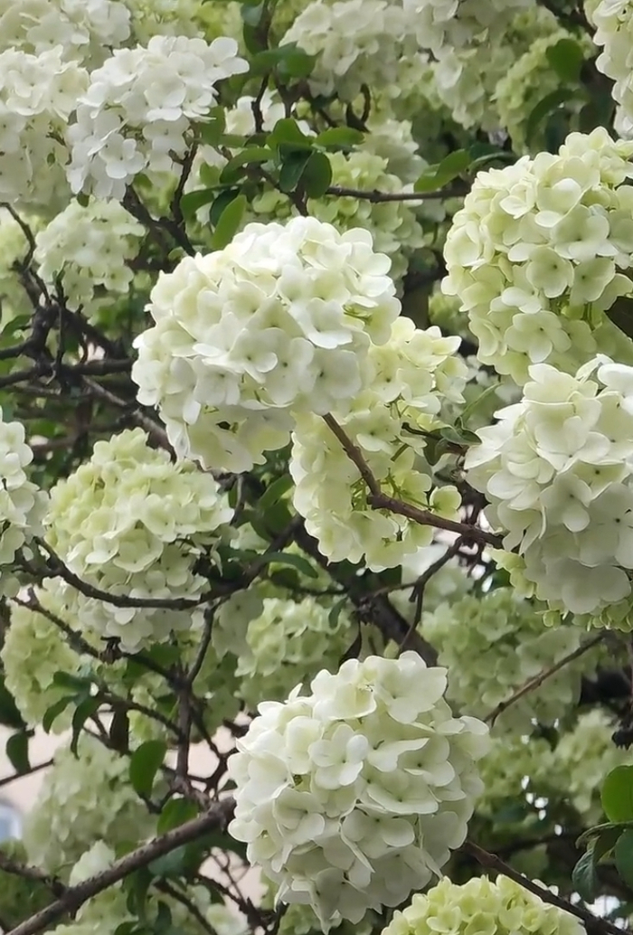 高枝带雨压雕栏,一蒂千花白玉团。绣球花的花型硕大,饱满锦簇,株型丰满,叶片碧绿光洁,花开时十分繁茂,数十朵小花簇拥成团、抱团成球。位于零陵区卷烟厂内的绣球花林,绣球花朵如云如盖,一团团一簇簇,从几米高的枝头垂落到地面,美得震撼。