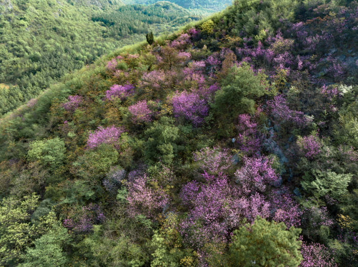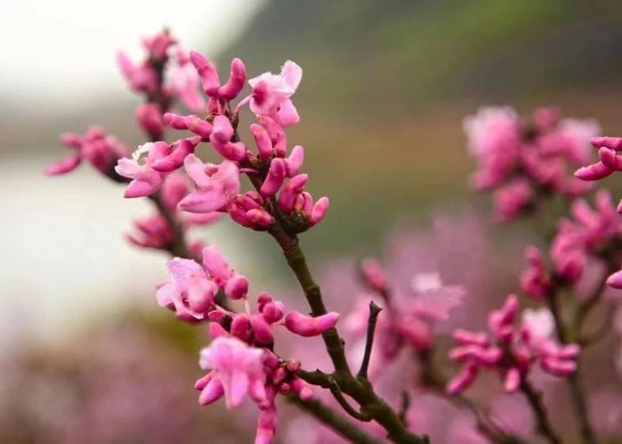 杂英纷已积,含芳独暮春。紫荆每年闻春而绽,密密麻麻的小花爬满了每根枝条,小小花朵的颜色如玫瑰一般美丽,盛开之时,犹如一群翩翩飞舞的蝴蝶盘旋在枝桠周围,密密层层间呈现出一幅满树嫣红的画面。