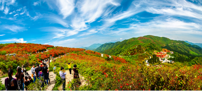 最惜杜鹃花烂漫,春风吹尽不同攀。人间四月芳菲尽,阳明杜鹃始盛开。每年4月初到5月中下旬,阳明山漫山遍野的野生杜鹃花竞相开放,清香绵延数十里,由山脚向山脊层层延伸,先紫后红,蔚为壮观,被誉为“天下第一杜鹃红”。