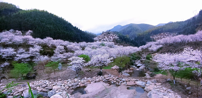 白白红红花面貌,丝丝袅袅柳腰身。蓝山县蓝山谷景区内,多株樱花盛放,浪漫绚烂如云似霞,朵朵樱花竞相开放,满树浪漫,美不胜收,弥漫着梦幻的浪漫气息。