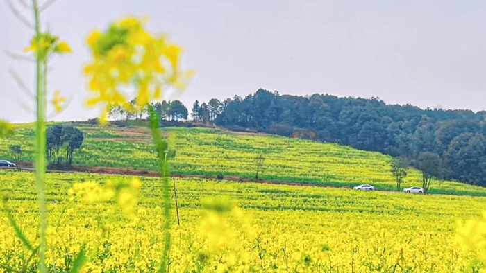 一片片油菜花田错落有致,黄绿相间的油菜花争相竞放,不时吸引三两蜜蜂、蝴蝶在上空盘旋飞舞。游客穿梭其间,或散步、或踏青赏花、或打卡拍照,已然陶醉在眼前这片金灿灿的油菜花海中。