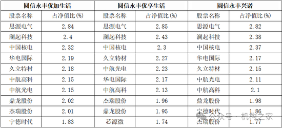 表2圆信永丰优加生活、圆信永丰优享生活、圆信永丰兴诺前十大重仓股