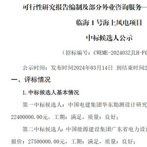 3月14日,大唐集团发布《可行性研究报告编制及部分外业咨询服务-2024年3月大唐临海1号海上风电项目中标候选人公示》的公告。