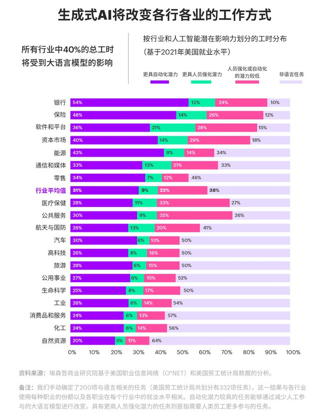 埃森哲研究发现,生成式AI将对各行业的工作时间产生影响,比率高达四成。