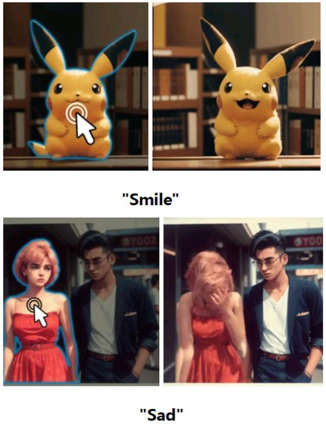 从“Follow-Your-Click”演示视频看,选中鸟、雷电、人、火箭等,便可根据“转头”“笑”“伤心”“发射”等简短提示生成几秒视频。在提示词为“伤心”的视频中,人物低头掩面哭泣,动作较流畅。