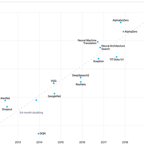 但是随着研究的推进,OpenAI发现人工智能系统除了需要算法创新,还需要使用最多的计算能力。根据OpenAI的估算,从2012年的AlexNet到2018年的AlphaGo Zero,计算量增加了30万倍。