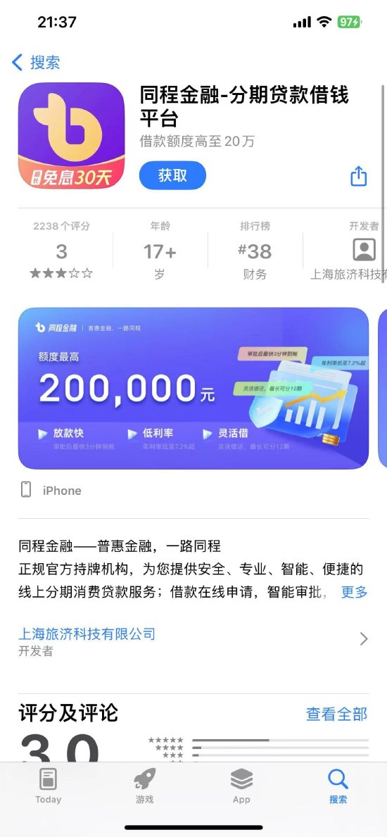 据手机应用商店,同程金融App的开发者为上海旅济科技有限公司。
