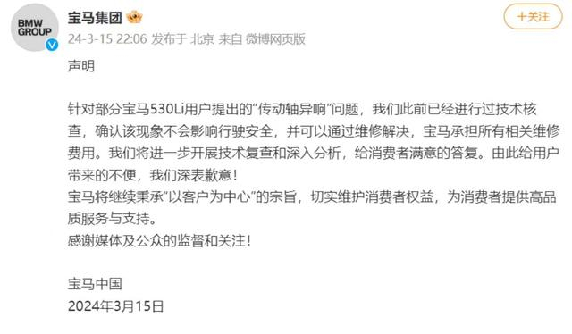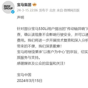 红星资本局3月15日消息,央视“3·15”晚会曝光了宝马530Li车型传动轴异响问题。对此,宝马集团在微博发布声明回应称,针对部分宝马530Li用户提出的“传动轴异响”问题,公司此前已经进行过技术核查,确认该现象不会影响行驶安全,并可以通过维修解决,宝马承担所有相关维修费用。宝马集团表示,将进一步开展技术复查和深入分析,给消费者满意的答复。由此给用户带来的不便,深表歉意。