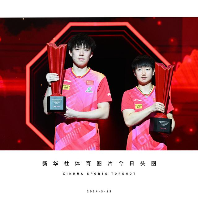 3月15日,中国组合孙颖莎(右)/王楚钦在颁奖仪式上合影。