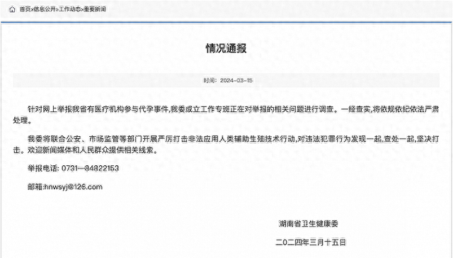 3月15日,湖南省卫生健康委员会官网发布情况通报,针对网上举报湖南省有医疗机构参与代孕事件,卫健委成立工作专班正在对举报的相关问题进行调查。一经查实,将依规依纪依法严肃处理。卫健委将联合公安、市场监管等部门开展严厉打击非法应用人类辅助生殖技术行动,对违法犯罪行为发现一起,查处一起,坚决打击。