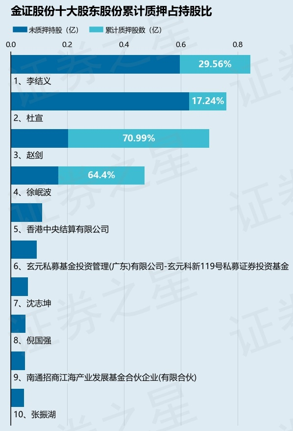 截止本公告日,股东李结义已累计质押股份2500.0万股,占其持股总数的29.56%,股东杜宣已累计质押股份1312.5万股,占其持股总数的17.24%,股东赵剑已累计质押股份4970.0万股,占其持股总数的70.99%,股东徐岷波已累计质押股份3043.0万股,占其持股总数的64.4%。本次质押后金证股份十大股东的累计质押股份占持股比例见下图: