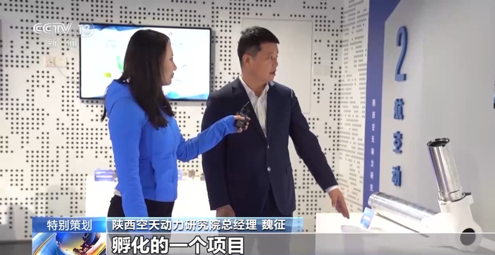 走入陕西空天动力研究院的展厅,这里孵化培育了从航天动力、航天材料、到飞机高端零部件制造等产业链上下游50余家企业。
