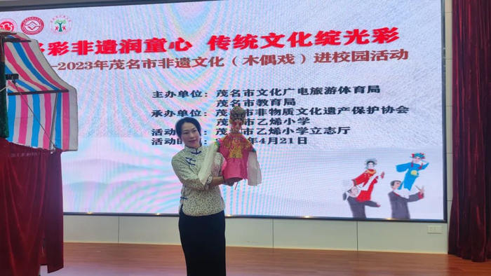 茂南单人木偶戏,在粤西地区民间也称为“木偶戏”“鬼仔戏”“扁担戏”“木头戏”,是当地古老的民间传统戏剧之一。明末清初由北方传入,历经番薯木偶、木头木偶、杖头木偶、布袋木偶发展演变而来。茂南单人木偶制作十分讲究,木偶头的嘴巴、眼珠及手能灵活转动。木偶制作采用柚木、白汁木雕刻,木偶手用木棍雕刻成圆形,装在肩膀两端,用手来控制转动。木偶服装用绸布制作。茂南单人木偶戏表演场地选择灵活,戏台搭建简单,在一张四方桌上竖起支架围上布,布置好灯光、音响、乐器即可。