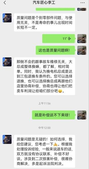 车子拖到4S店后,叶先生说,4S店称是设置的模块出现了问题。叶先生提供的和4s店相关技术人员微信截图显示,对方表示“质量问题是无疑的”,故障点是,驱动电机控制电脑出了问题,需要更换电机总成,符合三包退换条件。