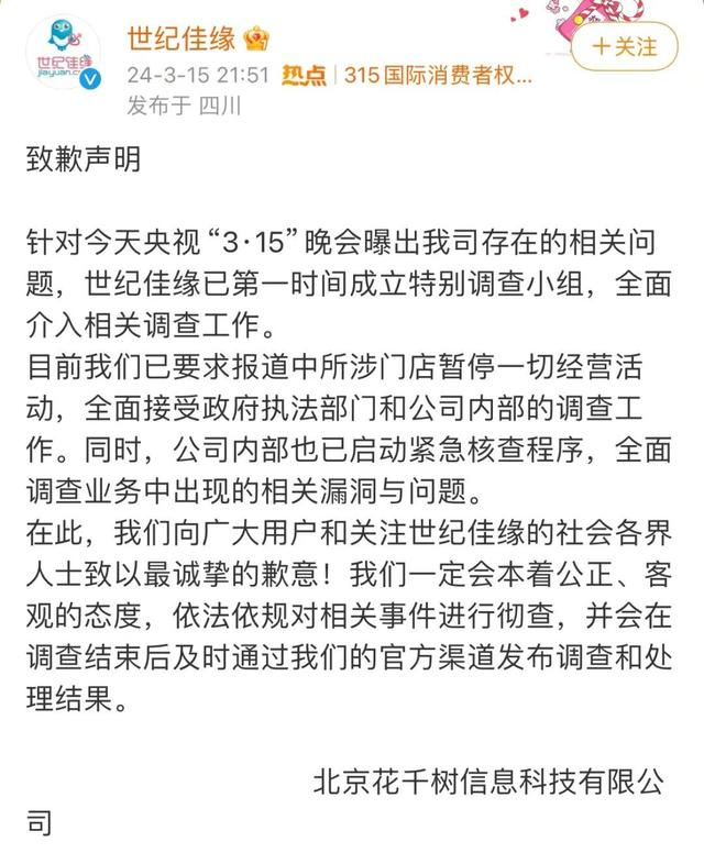致歉声明针对今天央视“3·15”晚会曝出我司存在的相关问题,世纪佳缘已第一时间成立特别调查小组,全面介入相关调查工作。目前我们已要求报道中所涉门店暂停一切经营活动,全面接受政府执法部门和公司内部的调查工作。同时,公司内部也已启动紧急核查程序,全面调查业务中出现的相关漏洞与问题。在此,我们向广大用户和关注世纪佳缘的社会各界人士致以最诚挚的歉意!我们一定会本着公正、客观的态度,依法依规对相关事件进行彻查,并会在调查结束后及时通过我们的官方渠道发布调查和处理结果。北京花千树信息科技有限公司