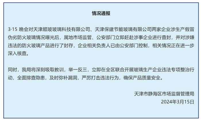 3月15日,天津市静海区市场监管局通报,当地市场监管、公安部门立即对天津顺玻玻璃科技有限公司天津保建节能玻璃有限公司两家涉事企业进行调查,并对涉嫌违法的防火玻璃产品进行了封存,企业相关负责人已由公安部门控制,相关情况正在进一步深入核查。