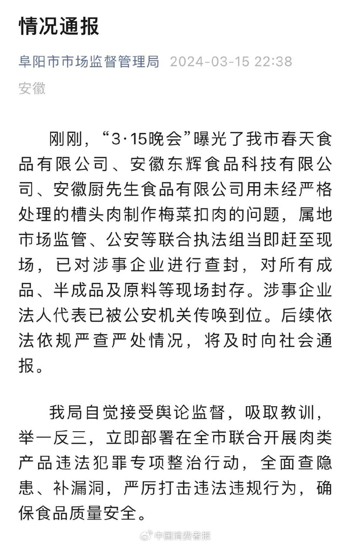 3月15日晚,阜阳市市场监管局发布通报,当地市场监管、公安等联合执法组已对被“3·15”晚会曝光的涉事企业春天食品有限公司安徽东辉食品科技有限公司安徽厨先生食品有限公司进行查封,对所有成品、半成品及原料等现场封存。涉事企业法人代表已被公安机关传唤到位。后续将依法依规严查严处。
