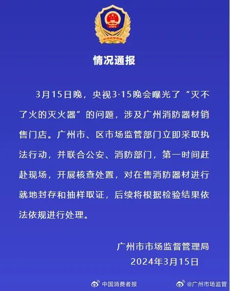 ▶ 3月15日晚,广州市市场监管局发布情况通报:针对“3·15”晚会曝光的广州消防器材销售门店涉嫌销售“非标”灭火器问题,广州市、区市场监管部门立即采取执法行动,并联合公安、消防部门,第一时间赶赴现场,开展核查处置,对在售消防器材进行就地封存和抽样取证,后续将根据检验结果依法依规进行处理。