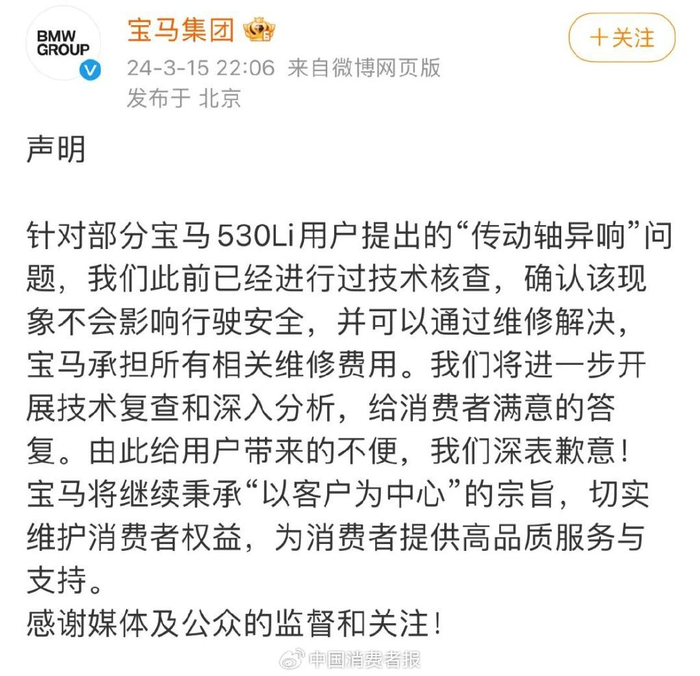▶ 3月15日,宝马集团发布致歉声明:“此前已经进行过技术核查,确认该现象不会影响行驶安全,并可以通过维修解决,宝马承担所有相关维修费用。”