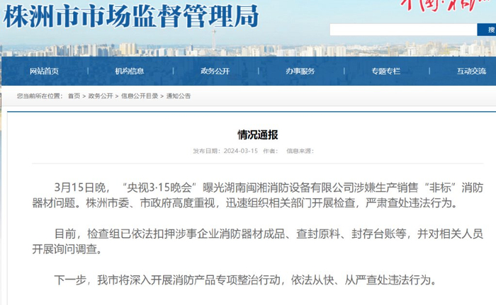 3月15日,株洲市市场监管局发布情况通报,针对湖南闽湘消防设备有限公司涉嫌生产销售“非标”消防器材问题,检查组已依法扣押涉事企业消防器材成品、查封原料、封存台账等,并对相关人员开展询问调查。