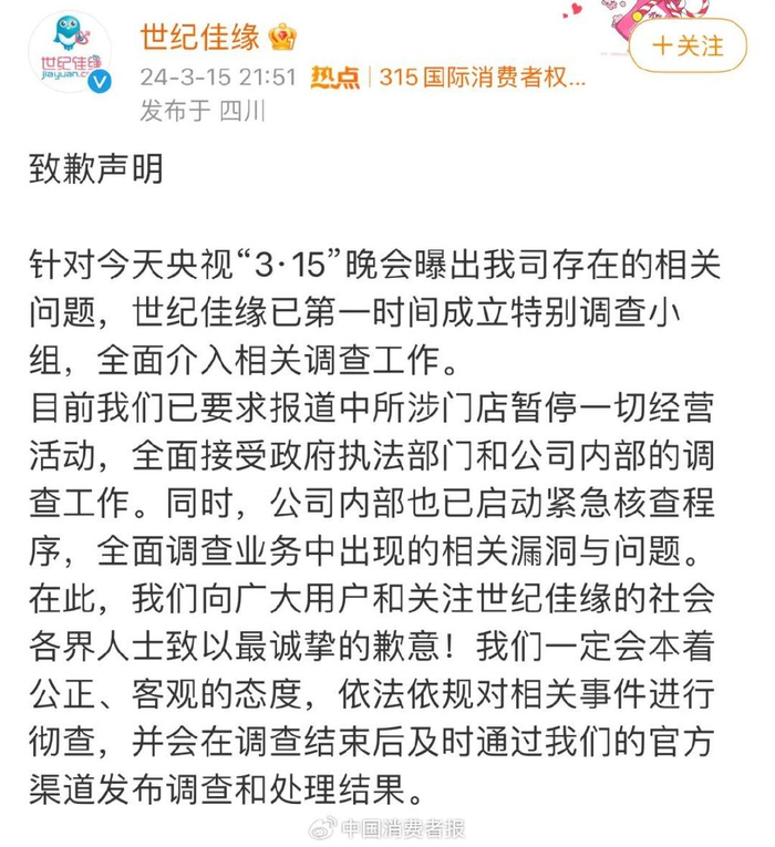 ▶ 3月15日,世纪佳缘发布致歉声明:“已要求报道中所涉门店暂停一切经营活动,全面接受政府执法部门和公司内部的调查工作。公司内部也已启动紧急核查程序,全面调查业务中出现的相关漏洞与问题。”