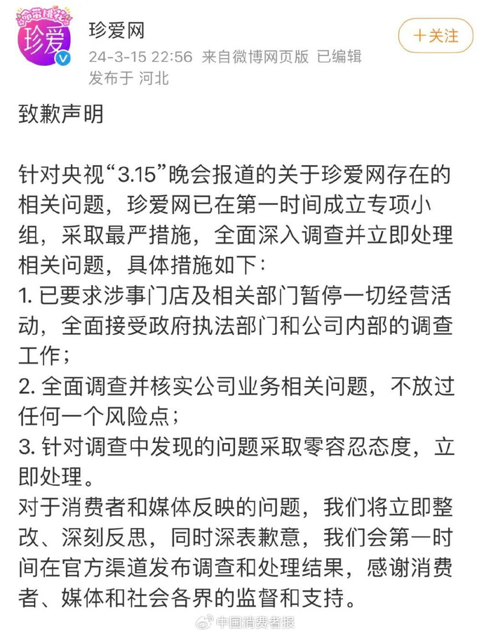 3月15日晚,珍爱网发布致歉声明:已要求涉事门店及相关部门暂停一切经营活动;全面调查并核实公司业务相关问题;针对调查中发现的问题采取零容忍态度,立即处理。