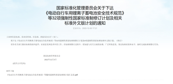 在国家标准化管理委员会官方网站可以查询到,2022年由工业和信息化部组织起草的强制性国家标准《电动自行车用锂离子蓄电池安全技术规范》已完成起草和征求意见阶段,目前正处于审查阶段。