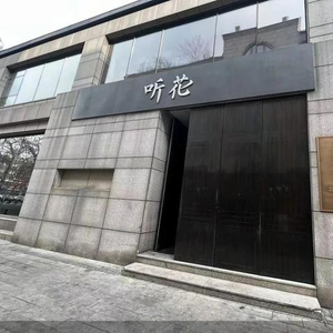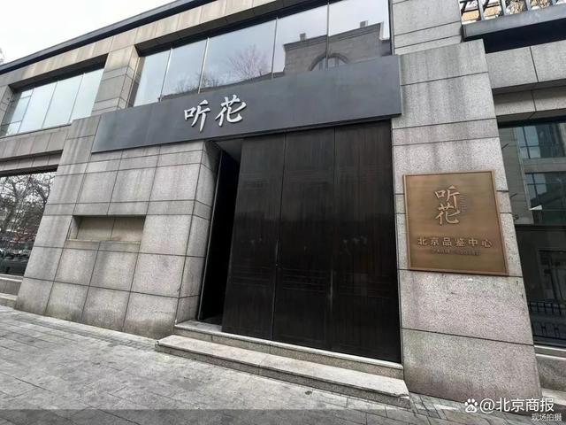 从外部看,该店与周边商铺有一定距离,独处半个街道,坐拥上下两层。黑色的“听花”牌匾十分显眼气派,门店右边的金色牌匾写着“听花北京品鉴中心”,并附上了沪市代码:600381,这正是听花酒母公司青海春天的股票代码。