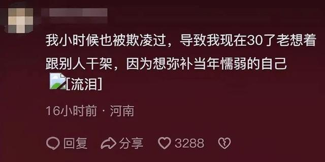 一位网友讲述自己小时候被人欺凌,但当时的他也不敢反抗,导致现在总有一种代偿心理,总想着用打架解决问题。
