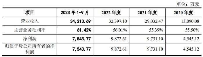 具体财务数据方面,报告期内(2020至2022年,以及2023年前三季度),公司分别实现营业收入1.31亿元、2.9亿元、3.24亿元和3.42亿元,实现净利润4545.12万元、9731.1万元、9872.61万元和7543.77万元。显然,2022年公司营收与净利润增速都明显放缓,而2023年前三季似有重回增长之势。