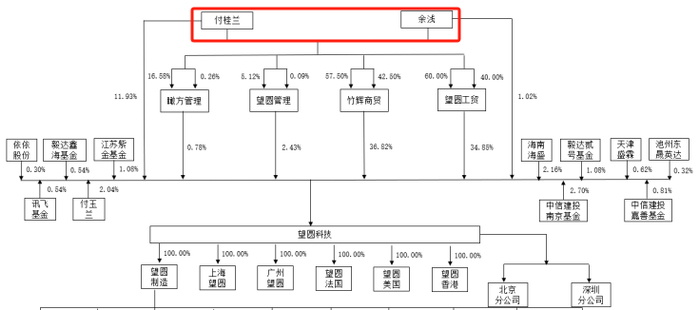 招股书显示,付桂兰、余浅分别直接持有公司680.1297万股、57.9975万股股份,占公司股本总额的11.9321%、1.0175%。付桂兰、余浅合计持有竹辉商贸、望圆工贸100%股权,两者通过竹辉商贸、望圆工贸间接持有公司71.662%的股份。此外,付桂兰作为执行事务合伙人分别通过望圆管理、瞰方管理间接控制公司2.4299%、0.7831%的股份。