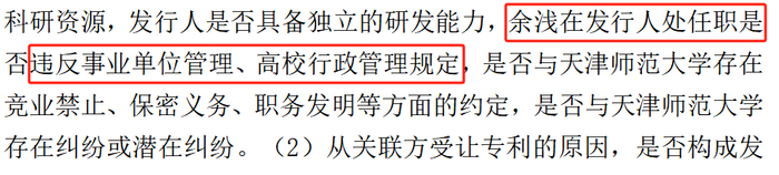 在此前的证监会反馈意见中,监管要求公司说明“余浅在发行人处任职是否违反事业单位管理、高校行政管理规定,是否与天津师范大学存在竞业禁止、保密义务、职务发明等方面的约定,是否与天津师范大学存在纠纷或潜在纠纷”。