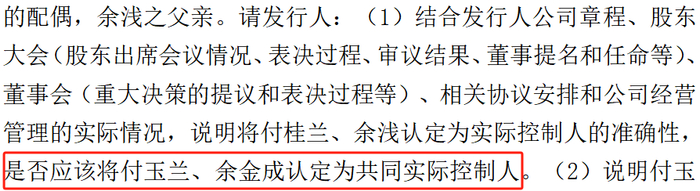 为此,证监会要求公司结合公司章程、股东大会、董事会、相关协议安排和公司经营管理的实际情况,说明将付桂兰、余浅认定为实际控制人的准确性,是否应该将付玉兰、余金成认定为共同实际控制人。