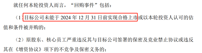 其中,大部分对赌条款随着公司申请上市已经清理,但回购条款依然保留。该回购条款显示,“目标公司未能于2024年12月31日前实现合格上市或以本轮投资人认可的估值和条件被并购的”,将触发“回购事件”。