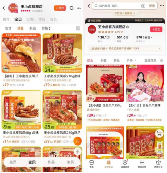 与之形成鲜明对比的是,以虎皮凤爪为主打产品新锐品牌王小卤,当前淘宝旗舰店粉丝数量为124万,多款产品销量在10万元以上;抖音旗舰店粉丝数量为130.1万,产品总销量551.2万元。
