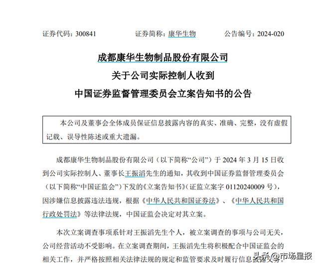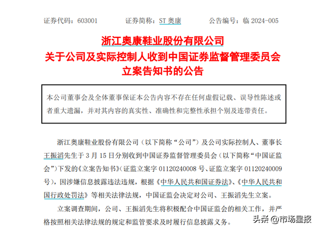 3月15日,ST奥康、康华生物均发布公告称,公司实际控制人、董事长王振滔于当日收到了中国证监会下发的《立案告知书》,因涉嫌信息披露违法违规,根据《中华人民共和国证券法》《中华人民共和国行政处罚法》等法律法规,中国证监会决定对其立案。