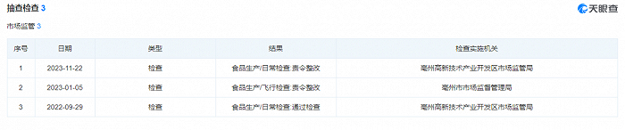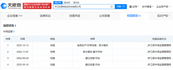 检测报告显示,滋禧堂散清茶的生产商为庐江和厚祥生物科技有限公司。天眼查查询信息显示,庐江县市场监督管理局曾在2023年10月、2022年11月对其产品抽检,结果都是责令整改。而在合肥市市场监督管理局2023年第47期食品安全抽检信息通告中,庐江和厚祥生产并销售的人参重瓣红玫瑰女神茶不合格,是因为霉菌不符合产品明示标准和质量要求。散清茶中也有重瓣红玫瑰等配料,但在生产商提供的散清茶检测报告上,只显示了铅、水分、二氧化硫三项检测合格,而不涉及霉菌等检测项目。