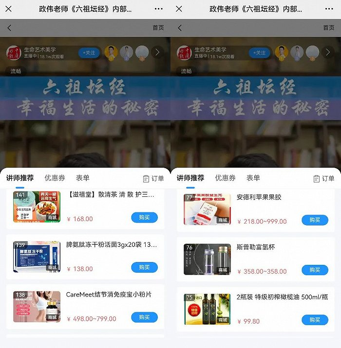 让施先生腹泻发烧的滋禧堂散清茶便是“老师”们直播带货的产品之一。这些“老师”一手以知识付费直播赚取高额课程费,一手以带货保健品赚取高达50%的佣金。