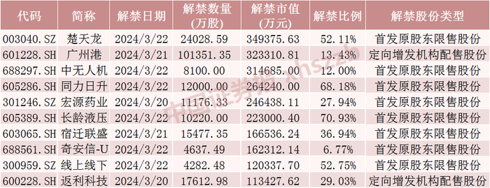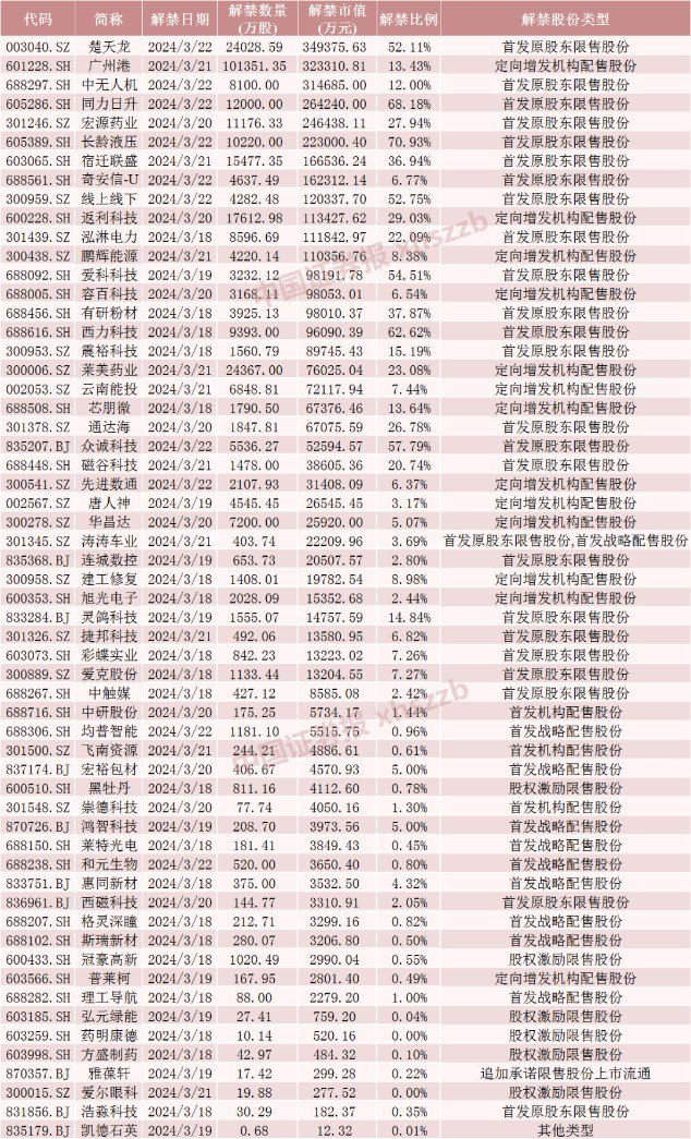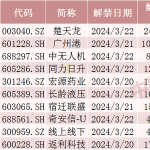 具体来看,Wind数据显示,楚天龙3月22日将解禁2.40亿股,均为首发原股东限售股份。广州港3月21日将解禁10.14亿股,均为定向增发机构配售股份。中无人机3月22日将解禁0.81亿股,均为首发原股东限售股份。