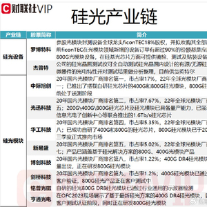 此外,博创科技3月12日在互动平台表示,公司基于硅光子技术的400G-DR4硅光模块已实现量产出货。沙特通信展览上发布的800G产品为应用于数据中心互联的800G高速有源铜缆。剑桥科技2023年8月28日发布投资者关系活动记录表显示,客户目前已经开始接受800G硅光光模块产品送样并且有小批量发货。公司本身的战略决定是不做硅光芯片,所以公司可以和数个业界最优秀的硅光芯片的公司深度合作,进展较快。亨通光电2023年4月28日在互动平台表示,公司400G硅光模块还处于客户测试认证阶段。400G光模块产品已获得小批量应用。800G光模块产品在领先交换机设备厂商通过测试。