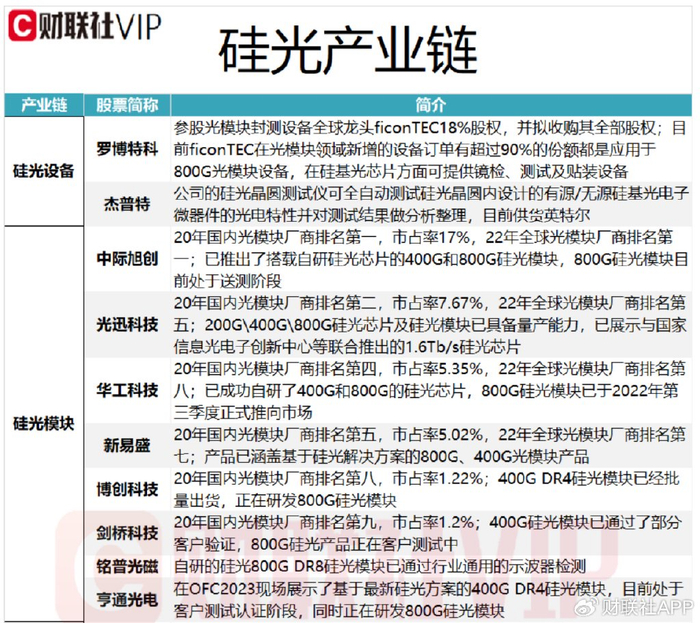 据财联社VIP盘中宝•数据栏目此前梳理,在硅光产业链中,硅光设备相关上市公司包括罗博特科和杰普特,硅光模块上市公司包括中际旭创、光迅科技、华工科技、新易盛、博创科技、剑桥科技、铭普光磁和亨通光电,具体情况详见下图: