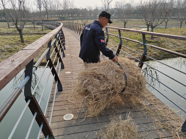 为确保天鹅们顺利繁殖,工作人员和志愿者做了大量工作。为了防止游客误入天鹅孵化区域,记者看到,在每一对已经做窝的天鹅活动区域外,都被工作人员装上了拦网。同时,为了避免人类行为对天鹅造成惊扰和伤害,志愿者和工作人员每天在北龙湖区域巡护,对一些游客的不文明行为及时进行劝阻。为了保障天鹅们有充足的“建筑材料”,工作人员和志愿者及时为每一对正在筑巢的天鹅补充干草。当日,记者就跟随保安王建亭从金融岛附近拉回一满车干草,然后给一家家天鹅送去,放在它们的巢附近。雌性天鹅在孵蛋期间几乎不进食,但在产卵期间会大量进食,工作人员和志愿者每天密切关注每一只天鹅的状态,及时对天鹅进行科学合理投喂。